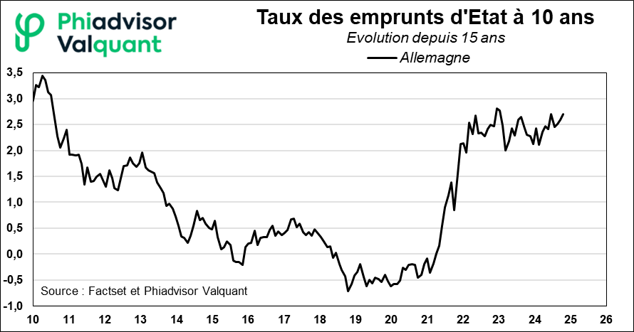 L'interprétation d'Eric Galiègue : La hausse des taux en Allemagne reflète à la fois un phénomène général de marché (fin du risque déflationniste et risque inflationniste) et une hausse significative des besoins de financement de l'Allemagne, qui a desserré le frein constitutionnel du déficit public, pour pouvoir se réarmer et investir dans ses infrastructures. De plus, certains investisseurs institutionnels vendent leurs obligations d'Etat pour acheter des actions, ce qui amplifie la tension des rendements. Donc, pour l'instant, le marché des actions ne prend pas ombrage de la hausse des taux.