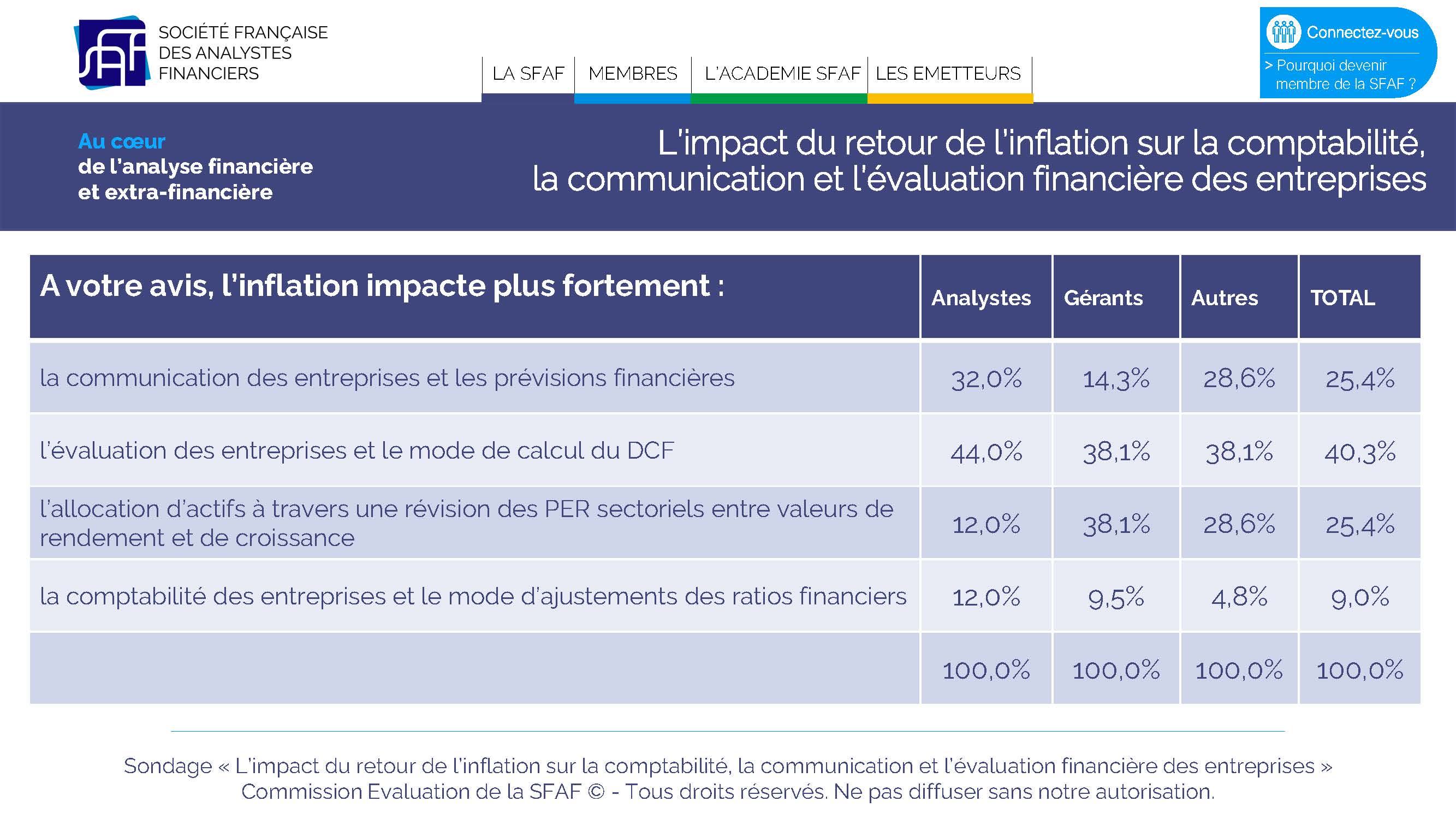Pour faire suite à l’organisation d’une conférence sur l’impact du retour de l’inflation sur la comptabilité, la communication et l’évaluation financière des entreprises le 10 mai, la commission Evaluation de la SFAF a interrogé les membres de l’association sur ce même sujet. Analyse des réponses par Eric Galiègue, président de la commission Evaluation.