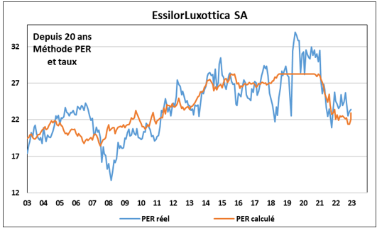 La multiplication de ce PER théorique avec les anticipations de BPA de l’époque, permet de déterminer un cours théorique pour Essilor Luxottica :