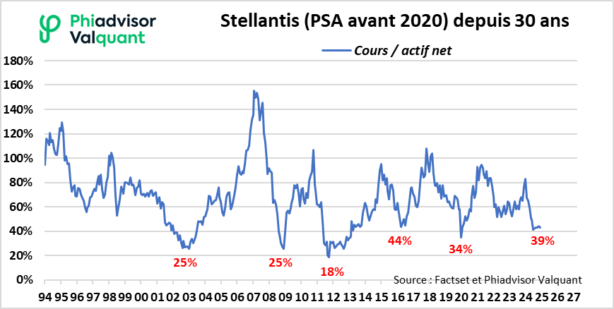 L'interprétation d'Eric Galiègue : Après une baisse profonde qui a amené le cours de Stellantis de 25 euros en mars 2024 à 11 euros aujourd'hui, le ratio C/AN vaut 39%, soit la moyenne des deux points bas des 10 dernières années. L'investissement est tentant, mais il faut attendre une amélioration du "news flow", très négatif en raison de la conjonction de 4 éléments majeurs : les droits de douane aux USA, la concurrence chinoise en Europe, les réglementations environnementales et le cycle économique qui menace de se retourner aux USA (40% des ventes de Stellantis).