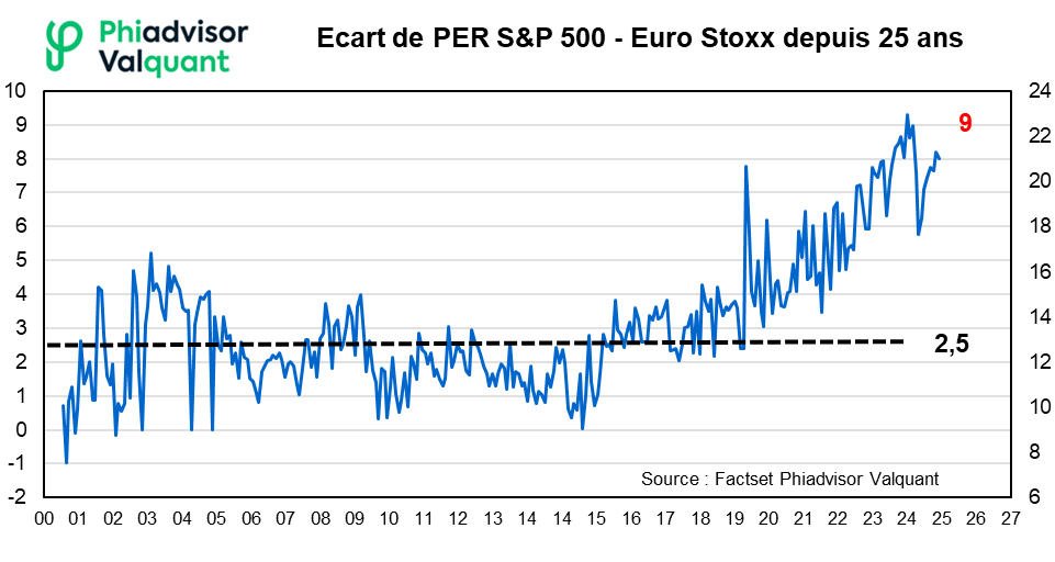 Alors que l'écart de PER entre les USA et l'Europe était de l'ordre de 2,5 points jusqu'en 2019, il s'est fortement approfondi jusqu'à atteindre 9 points actuellement.