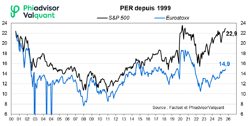 Le PER du S&P 500 est quasiment au plus haut depuis 25 ans, à près de 23. Il est près de 7 points supérieurs à sa moyenne 25 ans (16,6). Cet écart s'explique en très grande partie par l'évolution des grandes capitalisations technologiques américaines (les "7 magnifiques"), qui pèsent 30% de l'indice et montrent un PER supérieur à 30. En Europe, la dérive du PER est beaucoup plus limitée et s'explique aussi par quelques grandes actions comme ASML, Rheinmetall, Airbus et Safran.