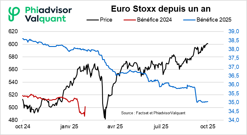 L'interprétation d'Eric Galiègue : La croissance attendue pour 2026 est comprise entre 12 et 16% (Stoxx et Euro Stoxx). La composition sectorielle de la croissance et le regain de la conjoncture économique en Allemagne fiabilisent ces anticipations. La croissance des bénéfices en 2026 pourrait enfin être au rendez-vous, après 3 ans de stagnation.