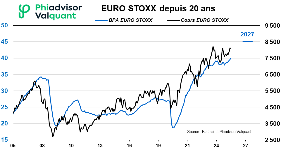 Depuis le creux de 2020, la dynamique des bénéfices des entreprises de l'Euro Stoxx est bien orientée. Après le puissant rebond de 2021-2022, qui a permis de dépasser le plus haut des bénéfices qui datait de 2007, un plateau de 3 ans laisse place à une forte accélération en 2026 (+14,9%) et 2027 (+12,1%).