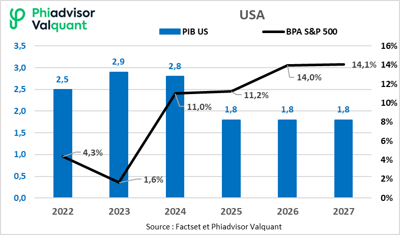 Aux USA, alors que la croissance du PIB était comprise entre 2,5 et 3% de 2022 à 2024, la croissance des bénéfices était limitée à moins de 5% en 2022 et 2023, avant de passer à 11% en 2024. En 2026 et 2027, alors que la croissance du PIB est limitée à 1,8%, celle des bénéfices accélère à 14%.