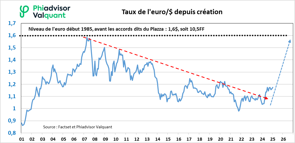 Le cours de l'euro/$ s'est apprécié de plus de 10% en 2025. Il semble avoir rompu le tendance baissière en place depuis 2007.