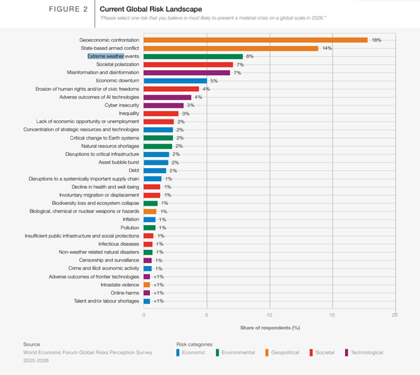 Le rapport sur les risques mondiaux 2026 du Forum économique mondial dépeint un environnement mondial de plus en plus marqué par les rivalités géopolitiques, la fragmentation économique et les pressions sociétales. À court terme, ces risques dominent les perceptions et l'attention des décideurs politiques. À plus long terme, cependant, les risques environnementaux continuent de figurer parmi les menaces mondiales les plus graves.