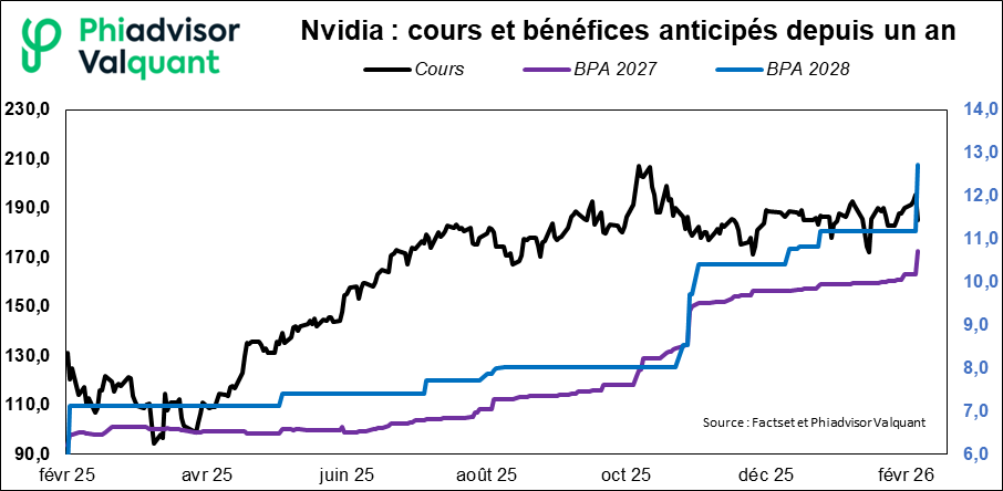 Depuis la mi-août, le cours de Nvidia, première capitalisation mondiale, est stable autour de 190$. Il a baissé de plus de 5% hier soir, en dépit d'une publication de résultat très supérieure aux attentes de consensus des analystes financiers. De fait, les anticipations de bénéfice ont progressé de 50% depuis l'été dernier.