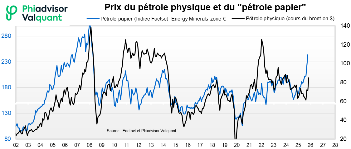 Il existe naturellement un lien entre le cours du "pétrole papier" (indice boursier Factset des actions pétrolières de la zone euro) et le cours du pétrole physique (cours du Brent en $). Depuis plusieurs mois, la hausse des cours du pétrole papier est plus importante que la hausse réelle du cours du pétrole.