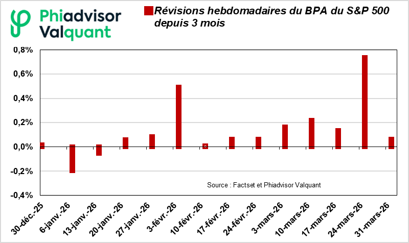 Depuis 3 mois, comme en mars, les analystes révisent en hausse significative leurs prévisions de BPA 2026 : +1,8%, ce qui porte la croissance 2026 à plus de 17% ! Les compagnies pétrolières et Micron Technologies participent largement à ce phénomène.