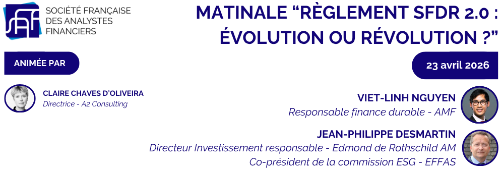 La SFAF organise une matinale sur le thème "Règlement SFDR 2.0 : évolution ou révolution ?" mercredi 27 mai de 8h30 à 10h, en présentiel dans nos locaux.