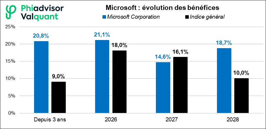 La croissance anticipée par le leader mondial des logiciels reste impressionnante et pourrait rebondir à près de 19% en 2028, après un "freinage" à près de 15% en 2027. La norme est proche de 20% pour cette société, qui capitalise plus de 3100 Mds $.