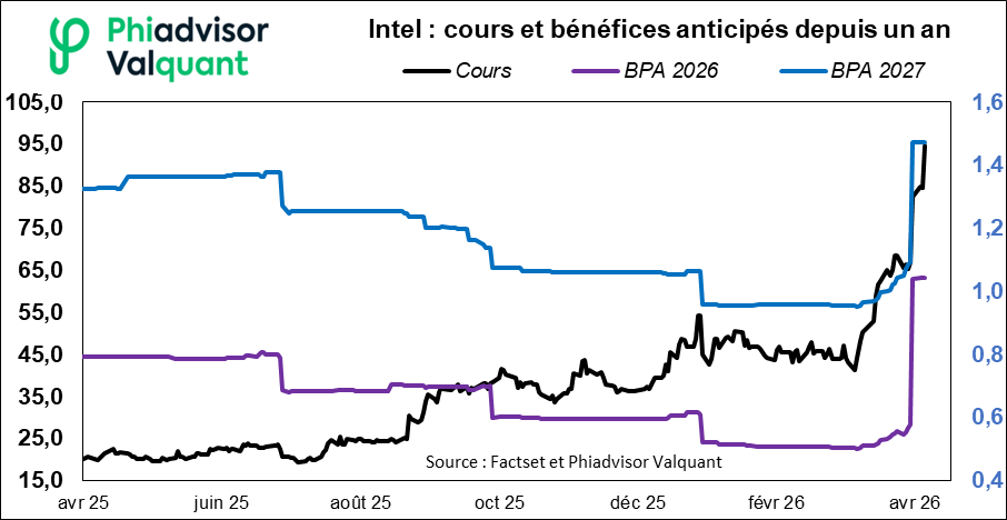 A la suite de la publication récente des comptes trimestriels d'Intel, le consensus des analystes a révisé en hausse de 100% sa prévision de bénéfice 2026.